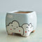 Rows of freshly watered Echeveria. In the center a Echeveria 'Pink Angel' Variegated has water droplets collecting on its leaves